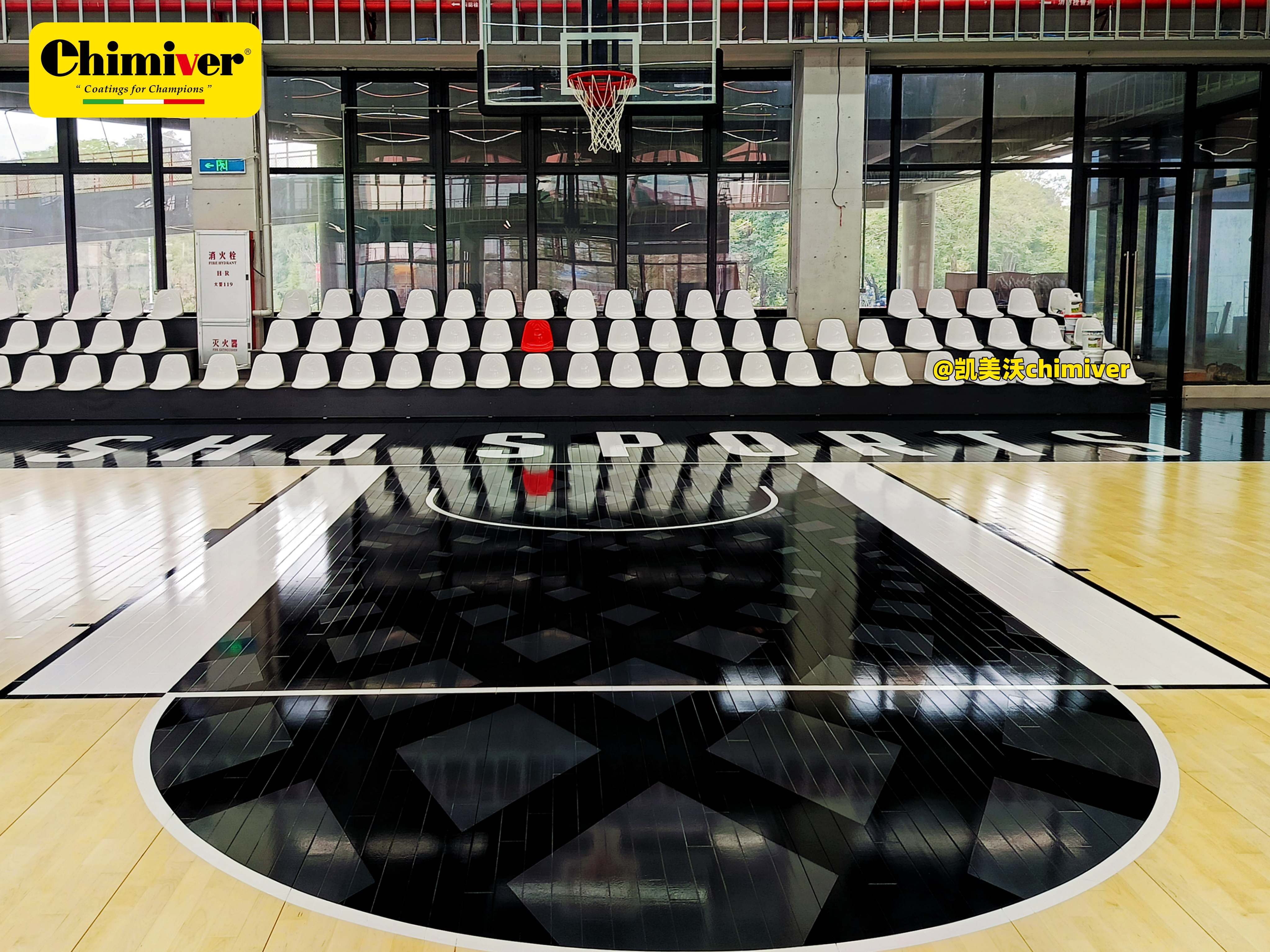 近日,位于顺德北滘的SHU球馆以其焕然一新的视觉面貌惊艳亮相。场馆整体采用了极具现代感的黑白灰色调,并创新性地应用了凯美沃专业透木纹彩漆系统。该技术不仅完美保留了运动木地板原有的天然纹理与质感,更通过高级灰阶色彩的注入,实现了自然肌理与现代简约美学的破界共生,为运动空间赋予了全新的艺术化表达与沉稳深邃的竞技氛围。